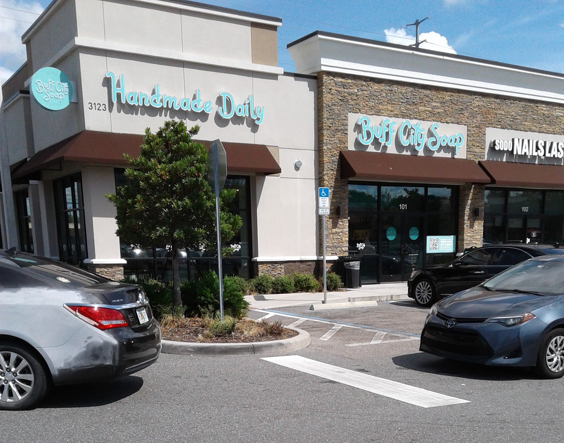 Hello there everyone, it's the Albertsons Florida Blogger writing for you once again on the Mid-South Retail Blog. As you may remember, I wrote a post for the MSRB last March, where we explored a former Fred's store in Titusville, FL that had since become an antique mall. As you may know, our usual MSRB host, Retail Retell, has been a bit busy lately. So while Retail Retell is working on other things, I'm here to fill the void for everyone with this post. My post today will be featuring a retail chain with Memphis roots called Buff City Soap (the company's name a play on Memphis's nickname of "the bluff city"). Buff City Soap is a company that specializes in the sale of homemade and organic soaps, and has been on a bit of a growth spurt lately. I actually had no idea about Buff City Soap until Retail Retell mentioned the company in passing during conversation of ours a while back. One day last fall when I was in Orlando, I had stopped to photograph a new Publix store in a former Lucky's Market building. On my way back to the car, I happened to look over at the little strip mall next door to the new Publix and saw Buff City Soap! It was my first time seeing one in person, so I figured I'd grab a few photos for an MSRB contribution, and here we are today!